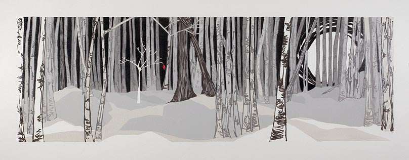 The print here is inspired by a poem by Carol Ann Duffy about Red Riding Hood. The connection is loose to say the least, I’m taking part in an exhibition for World Book Day next year and this is a possible entry. As you can see it is layer on layer and registration is critical. I also use cobalt dryers to speed up the drying of my now exquisitely thin ink layers. Cobalt dryer is a pretty purple liquid which I add in tiny drops to the inks (it doesn’t affect colour at all) and instead of my waiting around for days between layers, I have only to hop from one foot to the other for a few hours before I’m printing again.