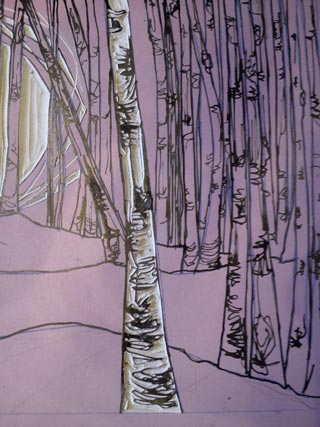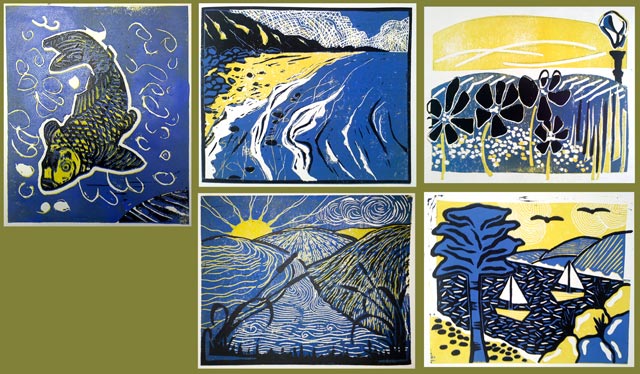 I’ve just finished a weekend of lino cutting at Missenden Abbey and my ten students excelled at their lino prints. I made them work in same three colours plus the white of the paper with some dramatic results as you can see here. As always when I teach, I learnt something myself: to revisit my mark making when I cut the lino. At the moment most of my lino work is very painterly, relying on blends of colour across the block. Now I am eager to be more imaginative with my cutting again and I’ll be starting with a little series of seasonal trees so watch this space…
