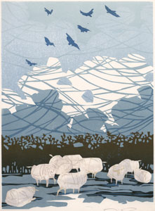 The first three prints are all fairly straightforward reduction prints using oil based ink on zerkal paper. The seaside one ‘Bitter Afternoon’ features some free inking (that sounds like something from the recent Olympics. In fact it just means mixing up a number of colours and using little rollers to paint the lino each time I print) and relies on my drawing on the lino with a dip pen and Indian ink to give the scratchy final line layer. ‘Frost at Full Moon’ has partial inking where I have just caught the tips of the fir trees with a suggestion of white and also relies on graduations of one colour into another. ‘Sheep and Sky’ is about playing with pattern. I often use birds for punctuation, breaking up the repeat of the clouds and giving the image more balance here.