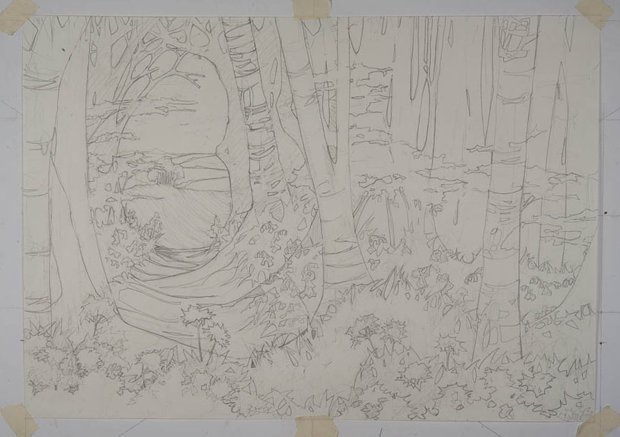 To work this out I hold the image in full colour in my head. Then I mentally pull it apart, like old fashioned animation, into its separate layers of colours and visualise how layers one to fifteen (it’s a big complicated print) look alone and then together in various combinations so that I can work out what part can be printed with one block and what part will benefit from several blocks printed over each other, where the shadows should be deep or sun should dapple etc. Then I delve into my experience of the paper and paints I plan on using, mentally running through how the pigments will actually work (some resist layering and others accommodate it) and what the paper can stand in terms of pressure, over printing and time spent damp. Then I start tracing, making adjustments and changes as I go.