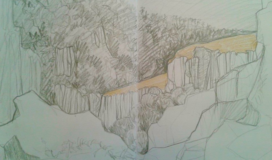 As always, I feel I work best when I am well outside my comfort zone and am currently collaborating with good friend Ian Phillips to produce a joint print of Cheddar Gorge. Just teetering on the edge of the cliffs drawing was honestly enough excitement for me, but we are attempting an ambitious mix and match with my Japanese water based woodblock creating a dreamy backcloth for Ian’s bold linocut foreground. As you can see from my working sketch,