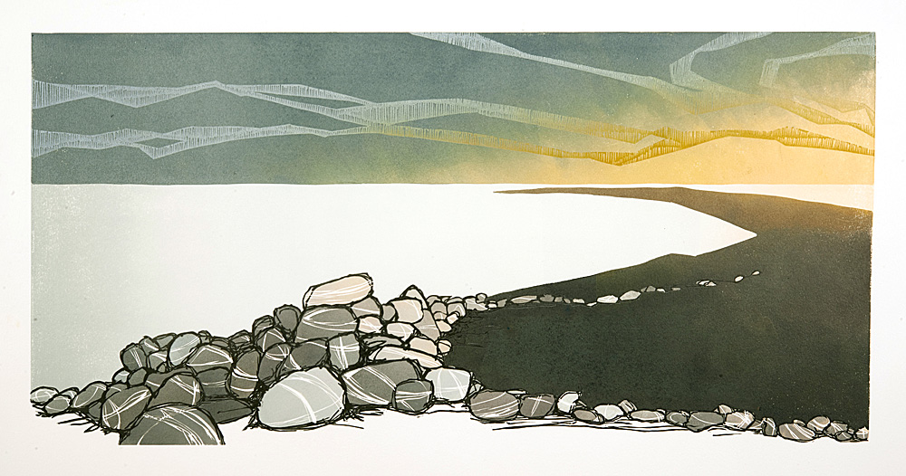 I also like white space and don’t necessarily abide by a regular edge to my work. I do try and be disciplined about using these techniques though; it is easy to fall into using them as a gimmick or trade mark. There has to be a good reason for my approach to each print and by no means all my linocuts are free painted or use white space. This print of ‘Barrow Beach after the Rainstorm’ uses both techniques.
