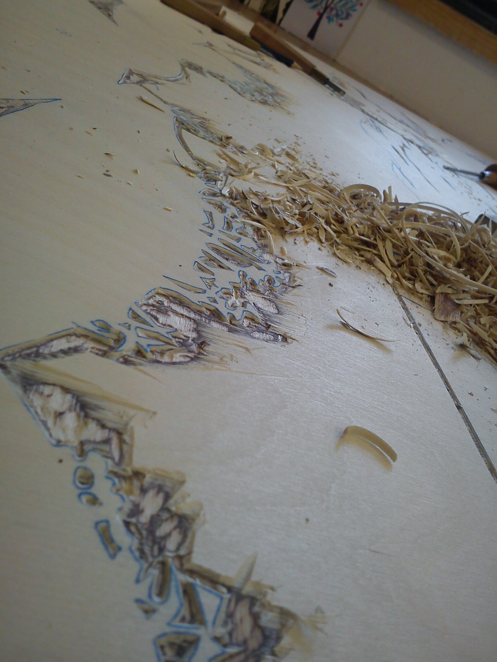 My hands are sore and currently covered in tape like a boxer. This isn’t the result of some terrible print related disaster, just a consequence of having to get used to cutting much harder wood. I have a commission, such a lovely one, to fill a health centre on the Isle of Wight with fourteen huge watercolour woodblocks. I’ve had to adopt a semi industrial approach as they each measure over a metre wide and my artist’s lime ply (the usual stuff I cut) simply isn’t big enough. I’m using sheets of carpenter’s birch ply and boy is it hard.