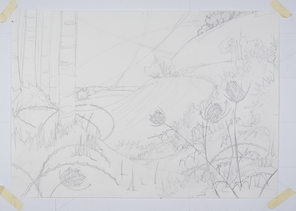 The drawing and planning comes with the print sized template drawing. These days all my drawing is done in outline with no colour. I only shade for planning purposes, not visual effect.